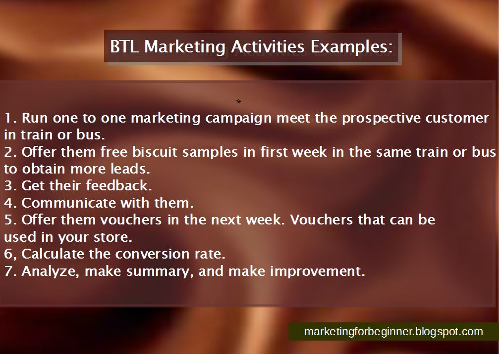 BTL activities example is promotion. Below the line promotion examples: direct promotion to the consumer, such as: direct mail, personal marketing by one to one meeting, discount promotion, and so on.